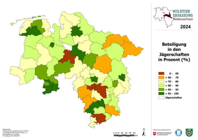 Seither belegen konstant hohe Beteiligungsraten von jenseits der 80 Prozent die hohe flächendeckende Akzeptanz, die die WTE bei den niedersächsischen Revierinhabern hat. Die LJN setzt seit Anbeginn auf eine freiwillige Beteiligung an der WTE und gibt die Zusage, die Revierdaten nicht an Dritte weiterzugeben bzw. nur mit Einwilligung der Revierinhaber.